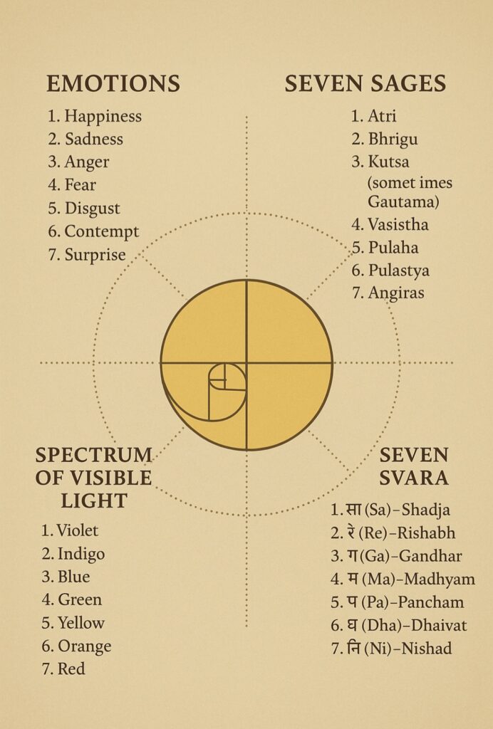 Conclusion: The Spiritual Symmetry of SevenThe recurring presence of seven in emotions, sages, colors, and musical notes reflects the inherent symmetry and unity of existence. Just as the Fibonacci sequence demonstrates mathematical harmony in nature, the number seven reveals spiritual, emotional, and cosmic patterns. By observing these patterns, practicing self-awareness, and acting in accordance with one’s inner understanding, humans can navigate life with grace, balance, and insight.In essence, our journey is a dance of interwoven elements—emotions, wisdom, colors, and sounds—all converging to create the grand symphony of existence. Understanding this interplay awakens the soul, aligns action with awareness, and allows us to live not as passive observers, but as conscious participants in the eternal rhythm of the cosmos.